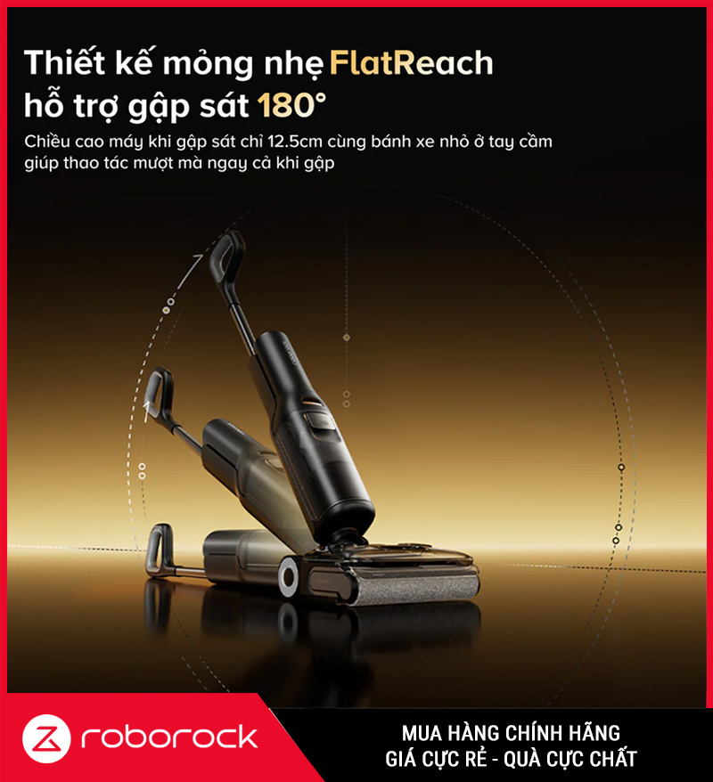 Roborock F25 ACE Combo được thiết kế với thân máy mỏng nhẹ và khả năng ngả sát mặt sàn, giúp bạn dễ dàng vệ sinh dưới gầm giường, gầm tủ, gầm ghế sofa hay các vị trí thấp mà không cần cúi người quá nhiều. Nhờ công nghệ FlatReach, máy có thể len lỏi vào mọi ngóc ngách mà các dòng máy cồng kềnh khác không thể tiếp cận.