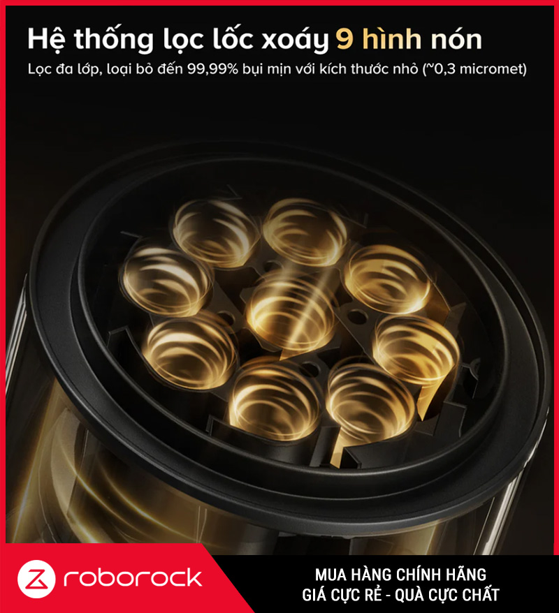 Được trang bị hệ thống lọc lốc xoáy Cyclone 9 hình nón, Roborock F25 ACE Combo mang lại khả năng lọc bụi mịn hiệu quả hơn, ngăn ngừa tắc nghẽn và giữ cho lực hút luôn ổn định. Các lớp lọc này còn giúp loại bỏ đến 99,9% bụi siêu mịn, vi khuẩn và các tác nhân gây dị ứng – đảm bảo không khí trong nhà luôn trong lành, sạch khuẩn.