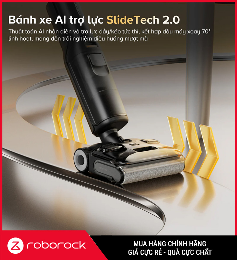 Roborock F25 ACE Combo được tích hợp bánh xe trợ lực thông minh SlideTech 2.0, sử dụng thuật toán AI để tự điều chỉnh lực di chuyển và độ bám sàn phù hợp với từng loại mặt sàn như gạch men, gỗ, thảm mỏng... Bánh xe giúp máy di chuyển nhẹ nhàng, mượt mà và ổn định, ngay cả khi xoay chuyển góc hẹp hay vượt chướng ngại vật nhỏ trong nhà.