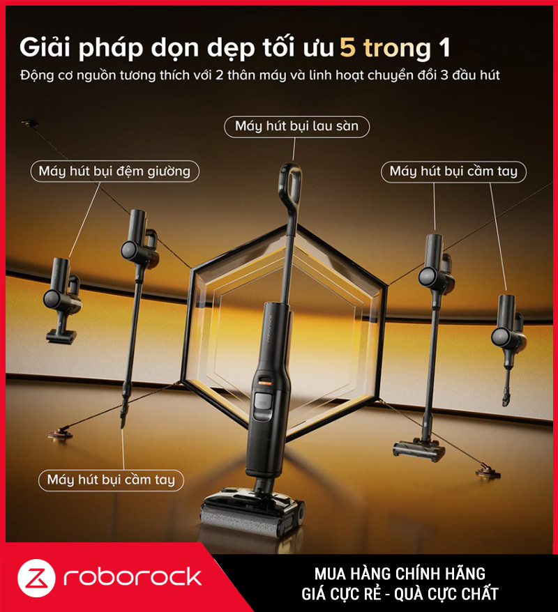 Roborock F25 ACE Combo hỗ trợ 5 giải pháp làm sạch trong 1 thiết bị, nhờ vào bộ đầu hút đa năng đi kèm, giúp người dùng dễ dàng thay đổi theo từng khu vực cần vệ sinh:
