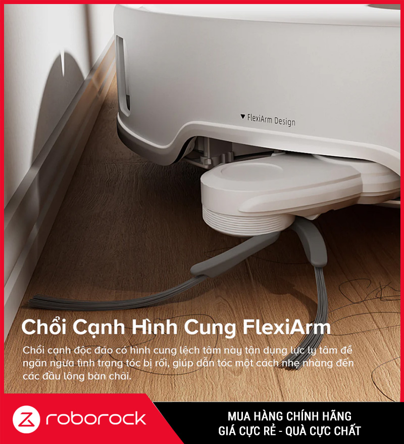 Một trong những cải tiến nổi bật nhất trên Roborock Q Revo Curv chính là công nghệ FlexiArm™ – một hệ thống cơ khí tự động mở rộng chổi cạnh và khăn lau để vươn tới các mép tường, gầm tủ, chân bàn ghế mà robot thông thường khó chạm tới.
