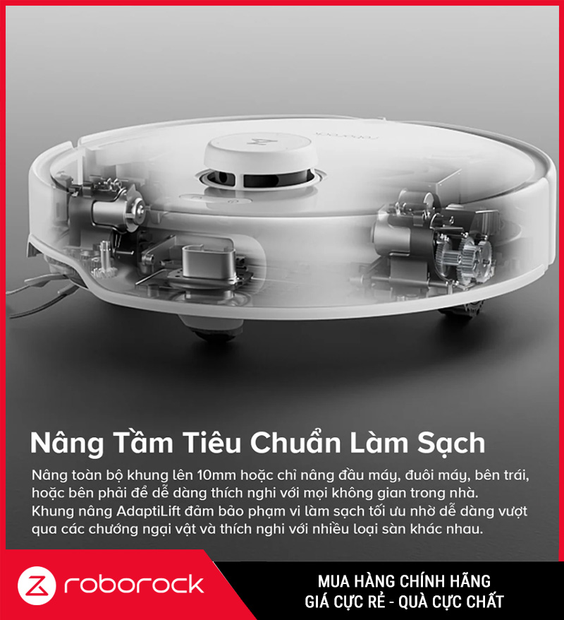 Roborock Q Revo Curv được trang bị khung gầm thông minh AdaptiLift™, cho phép robot tự động nâng – hạ chiều cao dựa trên điều kiện mặt sàn thực tế.