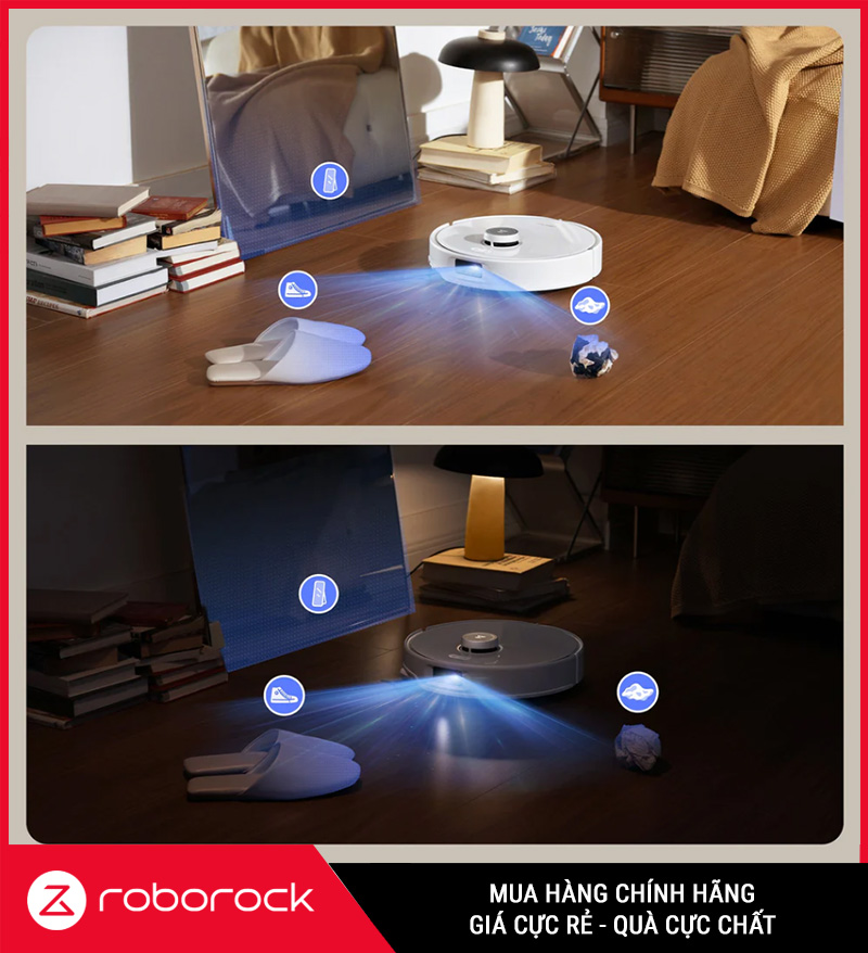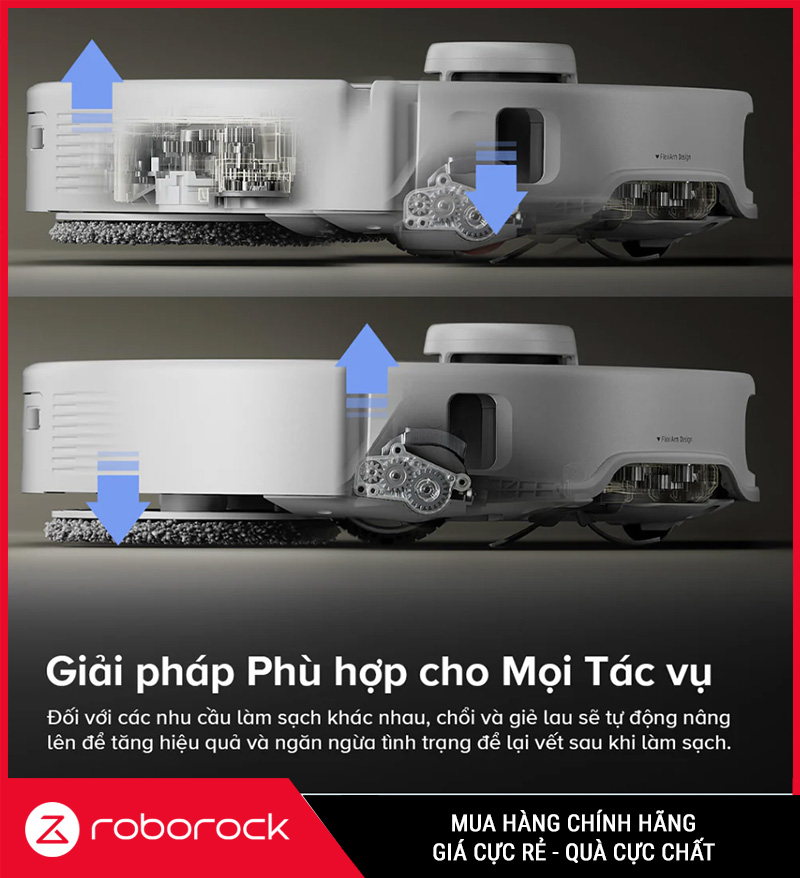 Khi phát hiện đang chạy trên thảm, hệ thống sẽ nâng khăn lau lên để tránh làm ướt thảm, đồng thời tập trung lực hút để làm sạch sâu các sợi vải. Ngược lại, khi di chuyển sang sàn cứng, robot sẽ hạ thấp để lau kỹ sàn bằng lực ấn vừa đủ.