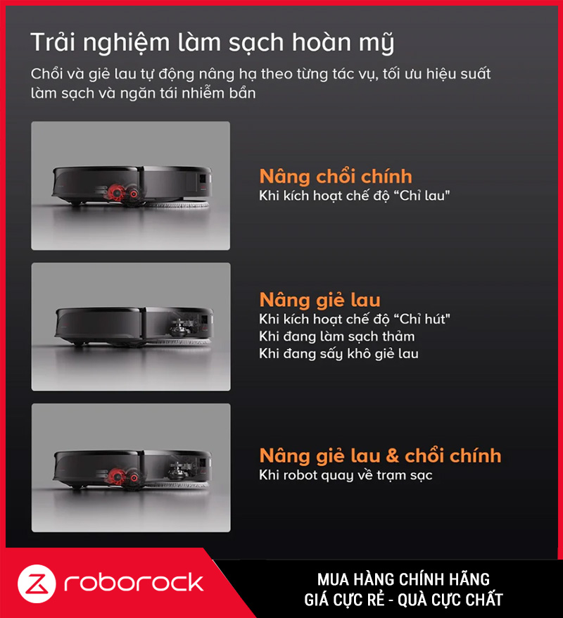 Khi robot di chuyển giữa các phòng, chổi và khăn lau sẽ nâng cao 10mm để tránh mang theo rác, đảm bảo sàn luôn sạch hoàn hảo.