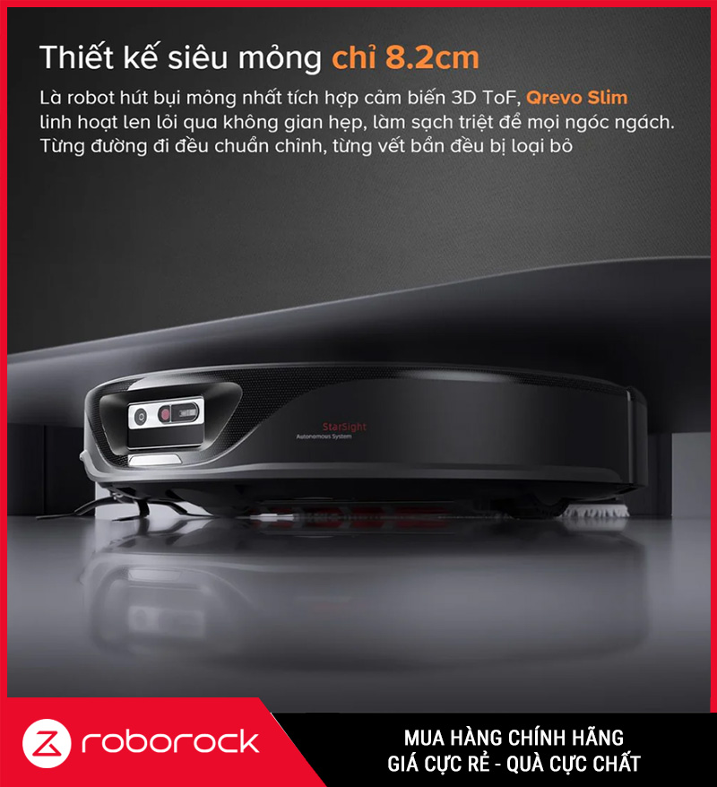 Roborock Q Revo Slim là siêu phẩm robot hút bụi lau nhà đến từ thương hiệu Roborock – nổi tiếng toàn cầu với công nghệ làm sạch đột phá. Phiên bản “Slim” mang đến sự khác biệt với thiết kế siêu mỏng chỉ 8.2cm, cùng loạt tính năng thông minh như lau xoay kép, điều hướng StarSight™, FlexiArm™, DuoRoller Riser™,… giúp tối ưu hóa khả năng dọn dẹp trong mọi không gian sống, đặc biệt là những khu vực hẹp và thấp mà robot thông thường không thể tiếp cận.