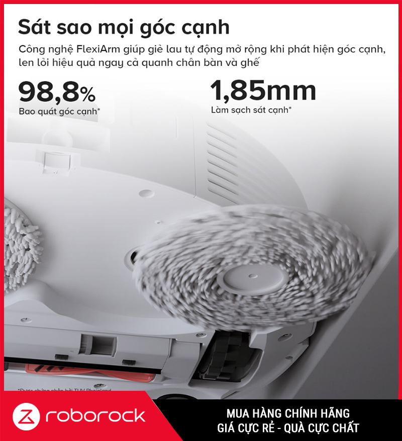 Với các robot hút bụi thông thường, khu vực mép tường, góc chân bàn ghế, hoặc cạnh giường thường là “điểm mù” rất khó tiếp cận. Nhưng với Roborock QRevo C Pro, vấn đề đó đã được giải quyết nhờ công nghệ FlexiArm Mopping độc quyền.