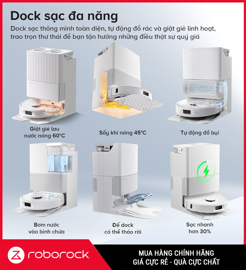 - Dock tự động giặt pad, sấy, cấp nước, đổ rác – rảnh tay thực sự