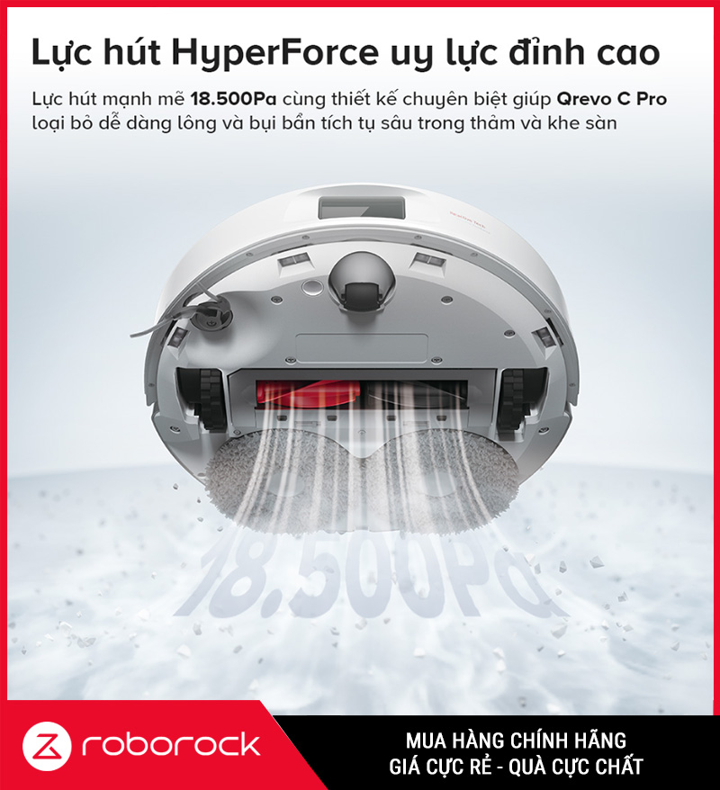 Một trong những điểm mạnh nhất của Roborock QRevo C Pro chính là công nghệ lực hút HyperForce thế hệ mới, mang lại áp suất hút lên đến 18.500Pa – mạnh mẽ hàng đầu trong dòng robot hút bụi hiện nay.