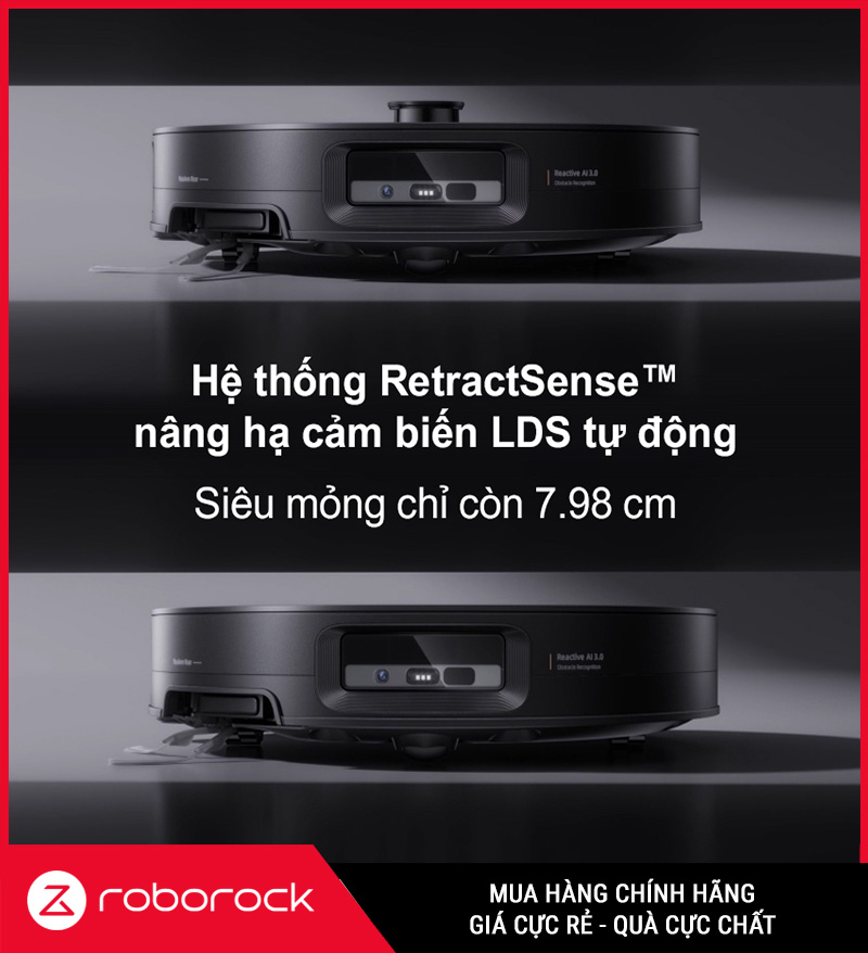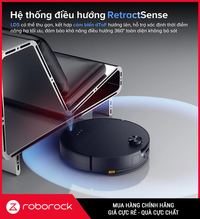 Đặc biệt hơn, robot được trang bị cụm cảm biến LDS (Laser Distance Sensor) có khả năng tự động nâng hạ – một bước cải tiến đáng giá. Khi cần quét bản đồ không gian, LDS tự nâng lên để phát hiện nhanh, chính xác vật cản và lập bản đồ. Khi không sử dụng, nó hạ thấp để giúp robot dễ dàng chui vào những khe hẹp – điều mà ít robot hút bụi siêu mỏng nào làm được.