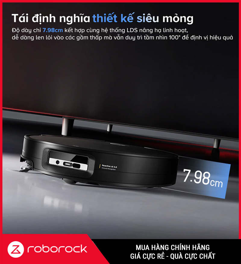 Roborock Saros 10 sở hữu thiết kế tinh gọn đáng kinh ngạc – chiều cao chỉ 7.98cm, cho phép robot dễ dàng luồn sâu vào các vị trí như gầm ghế, gầm tủ, hay những khu vực mà máy hút thông thường đành “bó tay”. Đây là một lợi thế lớn cho những căn hộ nhỏ, nơi từng centimet diện tích đều đáng giá.