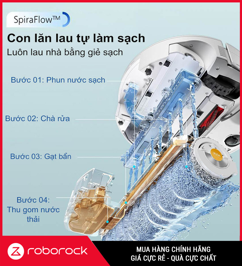 Nếu giẻ lau truyền thống thường gặp vấn đề lau xong kéo bẩn ngược (đặc biệt khi sàn có vệt bẩn ướt), thì SpiraFlow™ được thiết kế như một “chu trình lau khép kín”, giúp robot lau – làm sạch – tiếp tục lau với bề mặt con lăn luôn sạch hơn trong suốt quá trình.