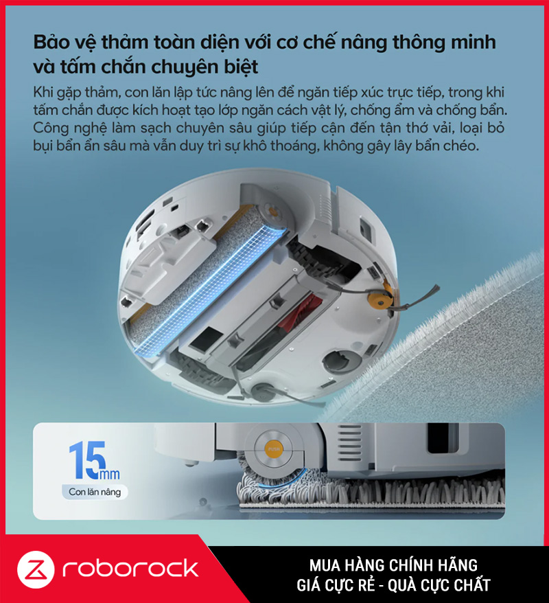 Khi vào khu vực thảm: ưu tiên hút (và hạn chế/không lau tùy thiết lập)